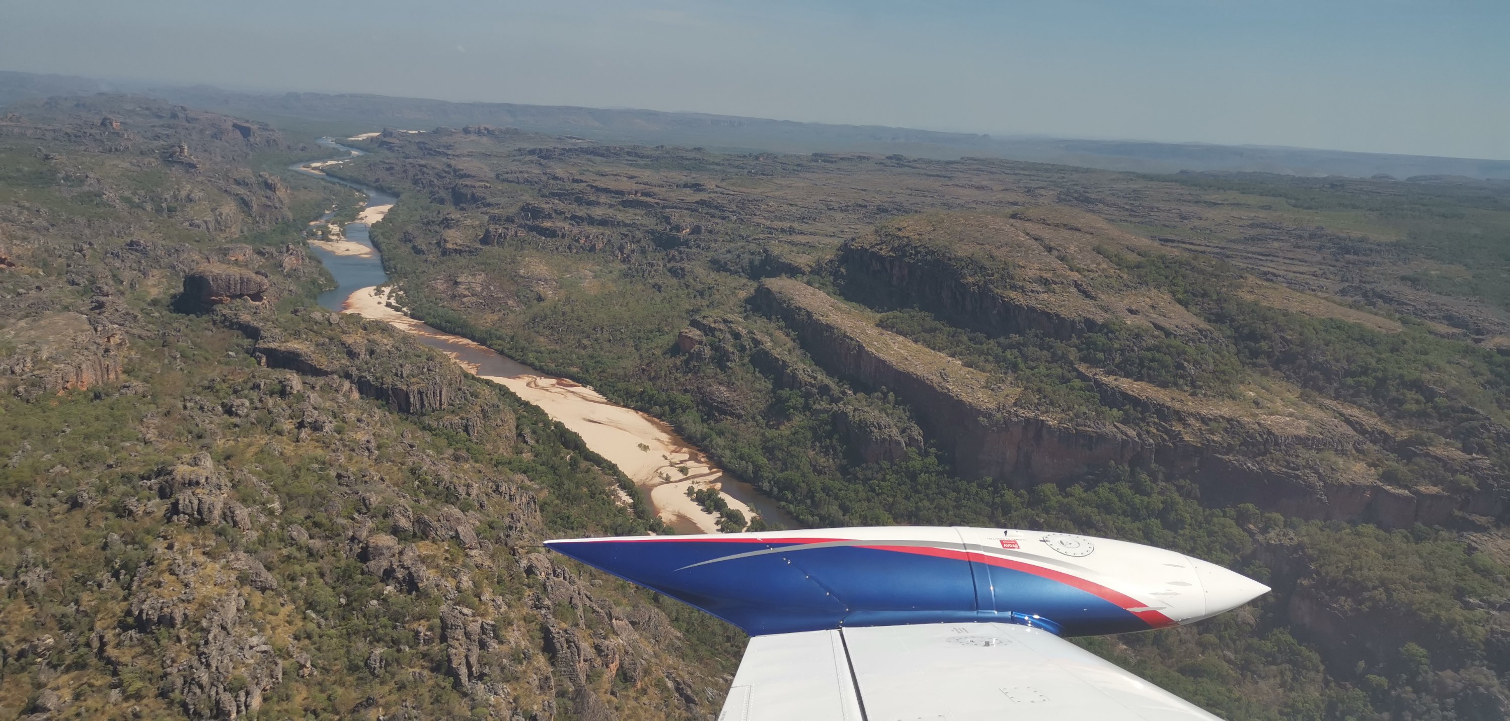 Mit dem Piloten sind wir in Summe fünf Personen (neben uns noch ein australisches Paar) in der Chessna 310R (6 Sitzer, Rufzeichen VH-LGC). Abwiegen, Sicherheitseinweisung und dann klettern wir in den Flieger. Ich war etwas wegen meiner Klaustrophobie besorgt, aber ich hatte mehr Platz als auf den meisten Linienflügen. Und so starten wir um 09:06 Uhr unseren Flug zum Kakadu National Park.