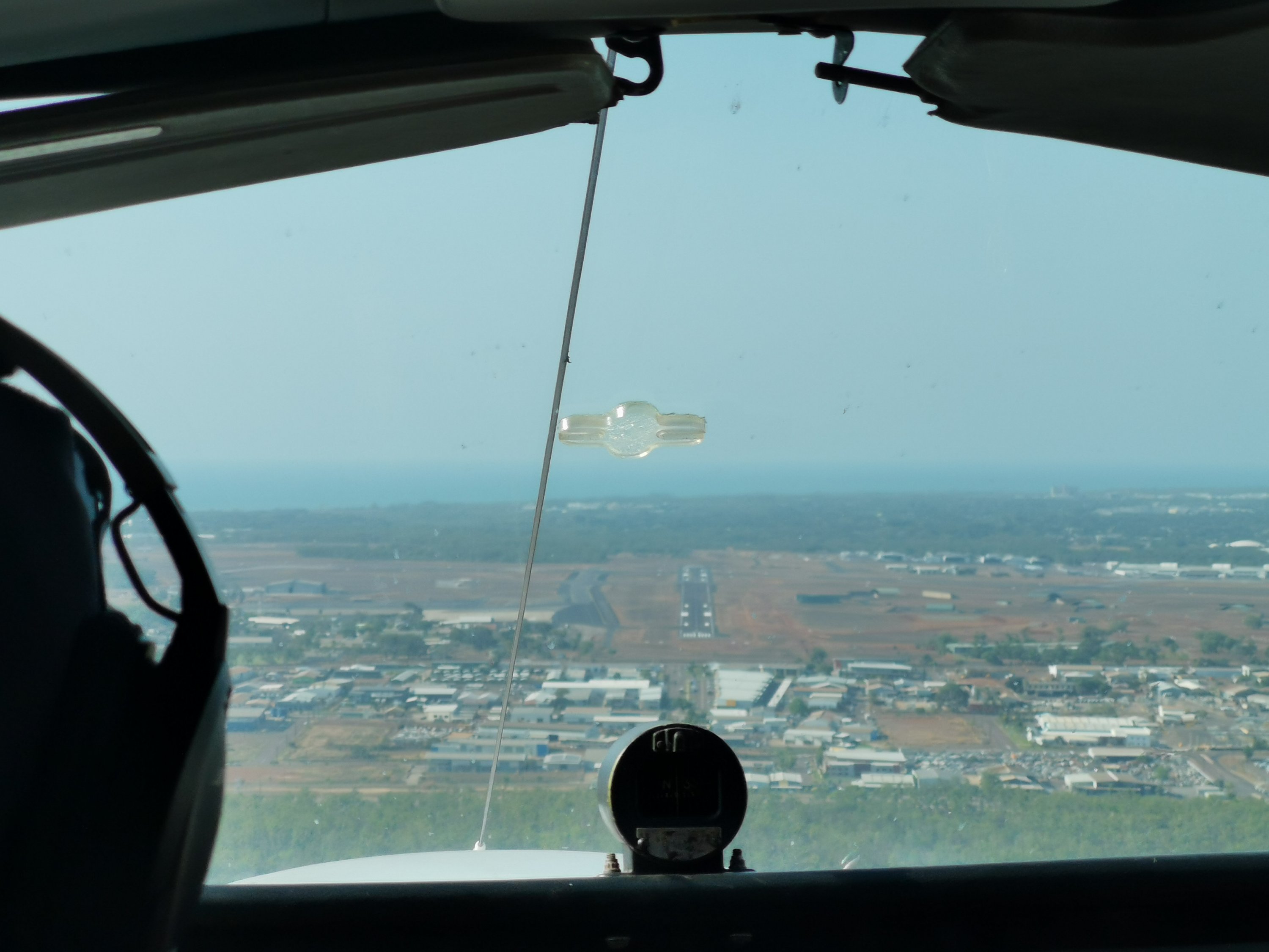 Checkliste abarbeitet, ein Funkspruch und los geht es. Diesmal fliegen wir auf direktem Weg in 6.500 ft Höhe zurück nach Darwin. Schon nach knapp 40 Minuten landen wir wieder sicher und rollen zurück zum Hangar von Kakadu Air.