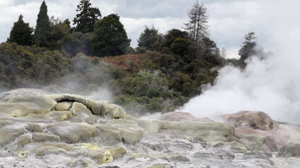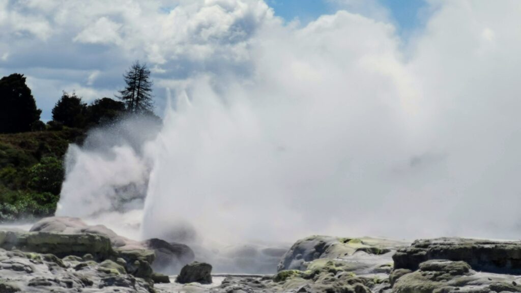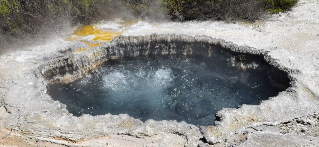 Unsere erste Etappe führt uns direkt nach Te Puia, zum Geothermalpark und zum Maori Arts- and Craftsinstitute. Der Pohutu Geysir ist der Größte in der südlichen Hemisphäre. Er bricht ewta ein- bis zweimal pro Stunde aus. Bei unseren Besuch hat er sich ganz besonders viel Zeit gelassen, aber das Warten war es wirklich wert. Die Fontäne, die er ausstößt, ist bis zu 30 m hoch und es zischt und brodelt. Die gesamte Anlage ist sehr weitläufig, der Weg führt durch das Thermalgelände und an jeder Ecke sieht man heißen Dampf, kochendes Wasser oder blubernden Schlamm.