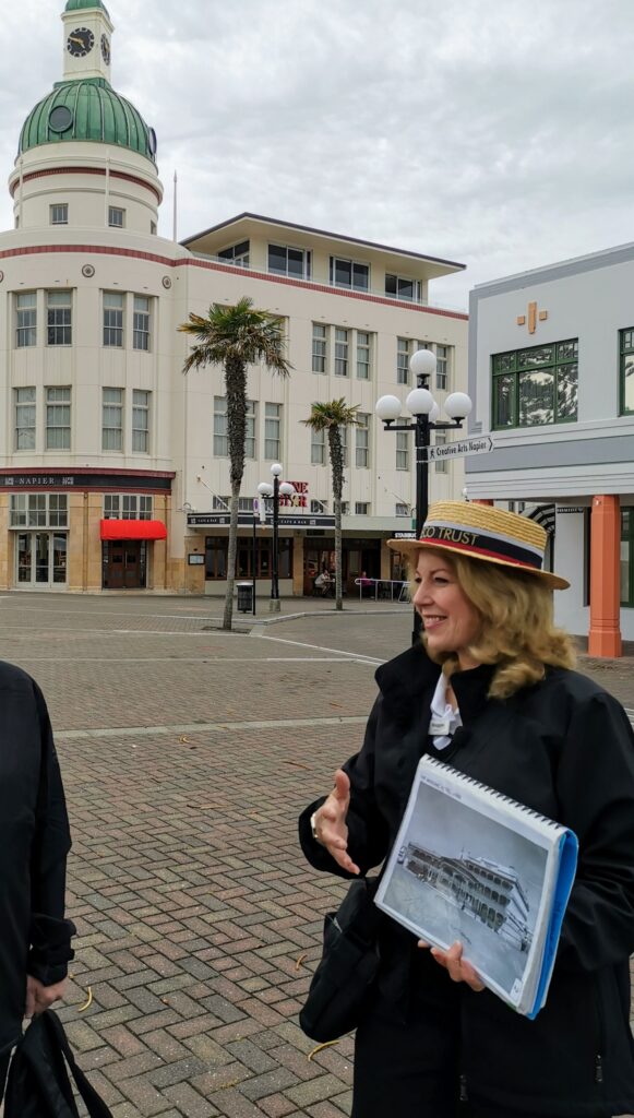 Beim anschließenden Spaziergang lernen wir sehr viel über die unterschiedlichen Dekoelemente des Art Deco Stils kennen. Eine Besonderheit in Napier ist die Mischung der Elemente des klassischen Art Deco mit Elementen der Maori. Sehr schön ist der Ortskern mit unzähligen Gebäuden aus dieser Zeit. Die Gebäude stehen seit einigen Jahren unter Denkmalsschutz (viel weniger streng als in Österreich) und die Zeit der dreißiger Jahre wird hier jedes Jahr in der Faschingszeit ganz besonders gefeiert.