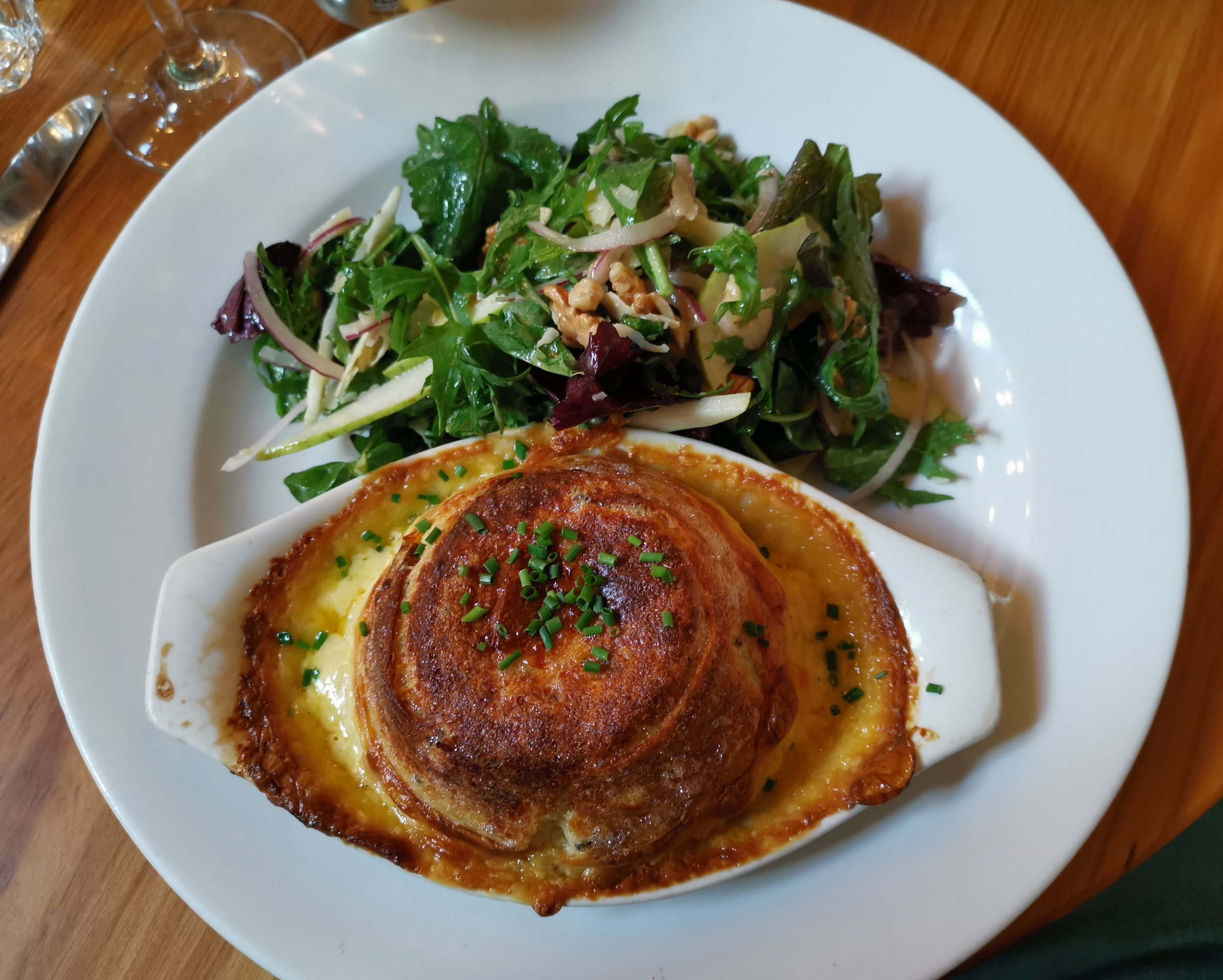 Das Essen ist wirklich hervorragend. Zuerst teilen wir uns eine Hühnerleberpaté (hervorragend – mit schwarzem Brot und Rhabarber Chutney) und dann das „double baked blue cheese souflé, grean leaf, pear & walnut salat“ – echt ein Traum. Der Wein dazu ist in Ordnung aber nach den Herzogweinen halt kein Highlight.