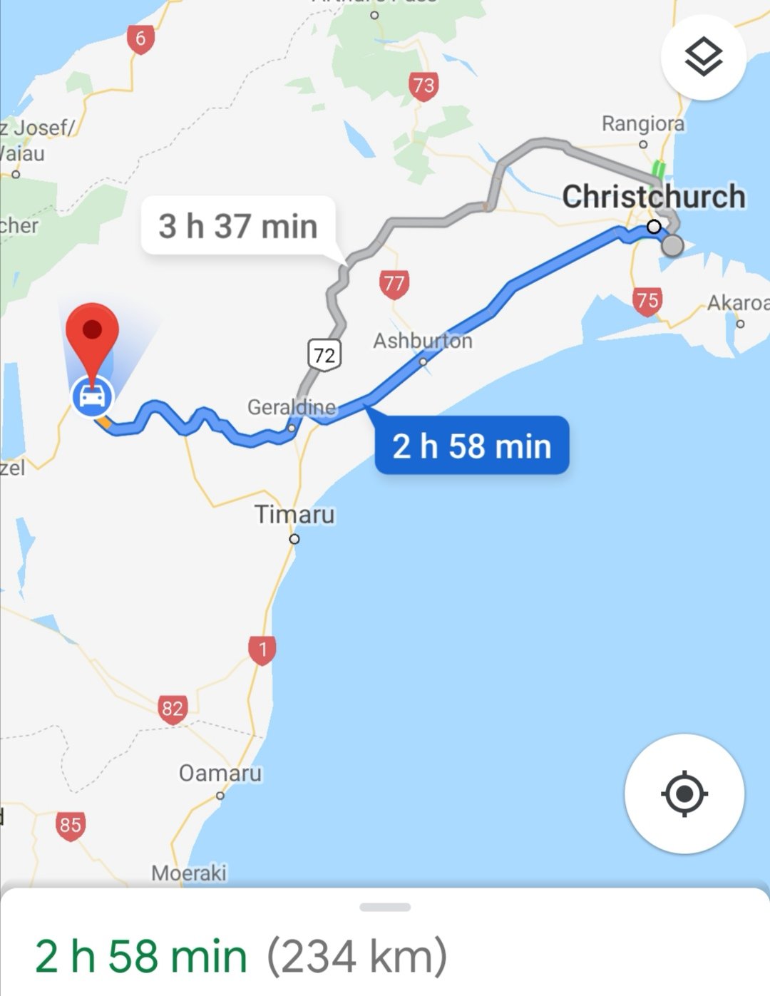 Zurück beim Auto starten wir dann um 12:15 Uhr unsere heutige Etappe nach Lake Tekapo. Es ist viel Verkehr – ein langes Wochenende liegt vor uns, am Montag ist hier Labour Day – und so geht es gemächlich aus Christchurch hinaus.